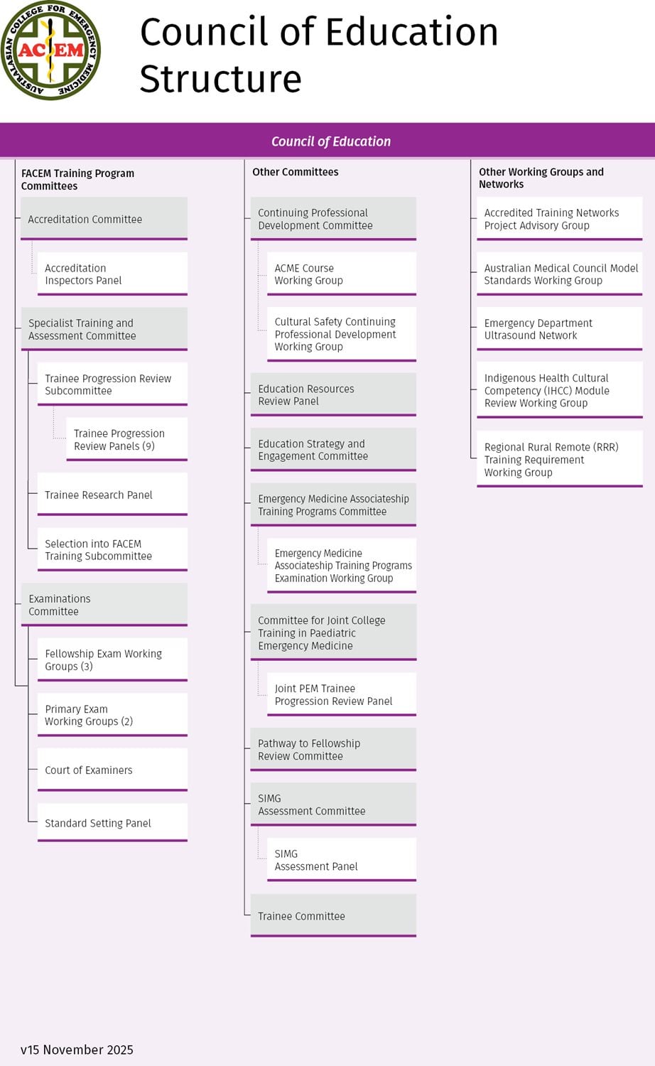 The following Council of Education (COE) entities have responsibility for a full range of education, training and professional development programs offered by the College.