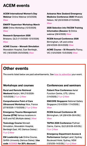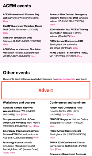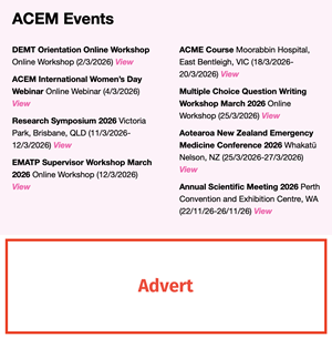 Event, course or workshop ads can be purchased in monthly increments and will appear in the ACEM Bulletin for the duration of that advertisement period. Special placement banner adverts are available across various ACEM platforms. Please note that the College does not offer free advertising.